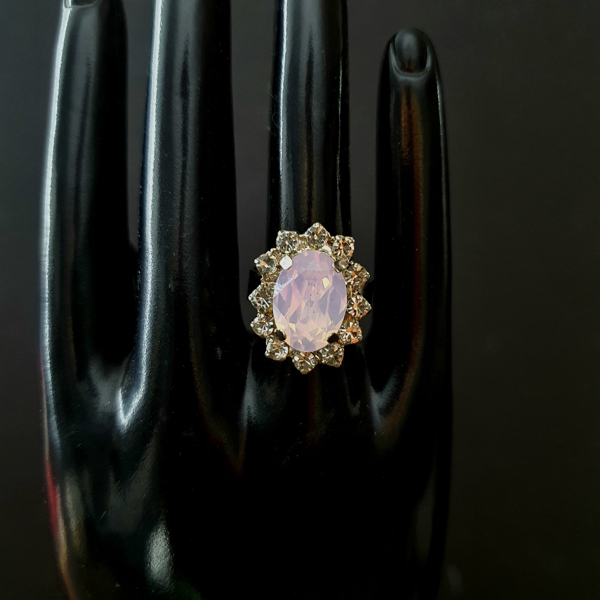 Anillo ajustable con cristales checoslovacos y cristal oval austriaco color rosa ópalo. 2 cms con aro ajustable en acabado plateado brillante.
