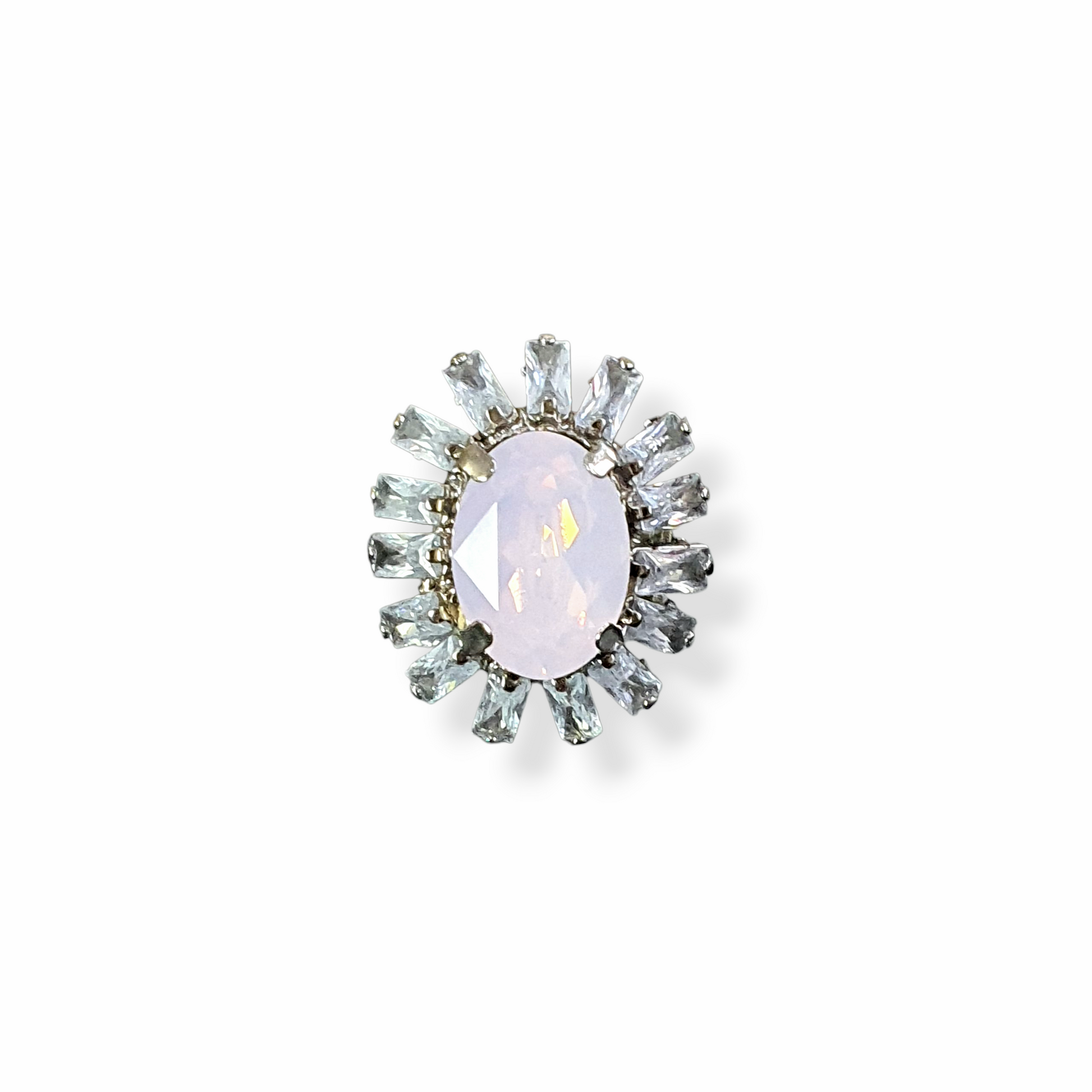 Anillo ajustable con cristal austriaco, zirconias en acabado plateado brillante. 2.5 x 2 cms.