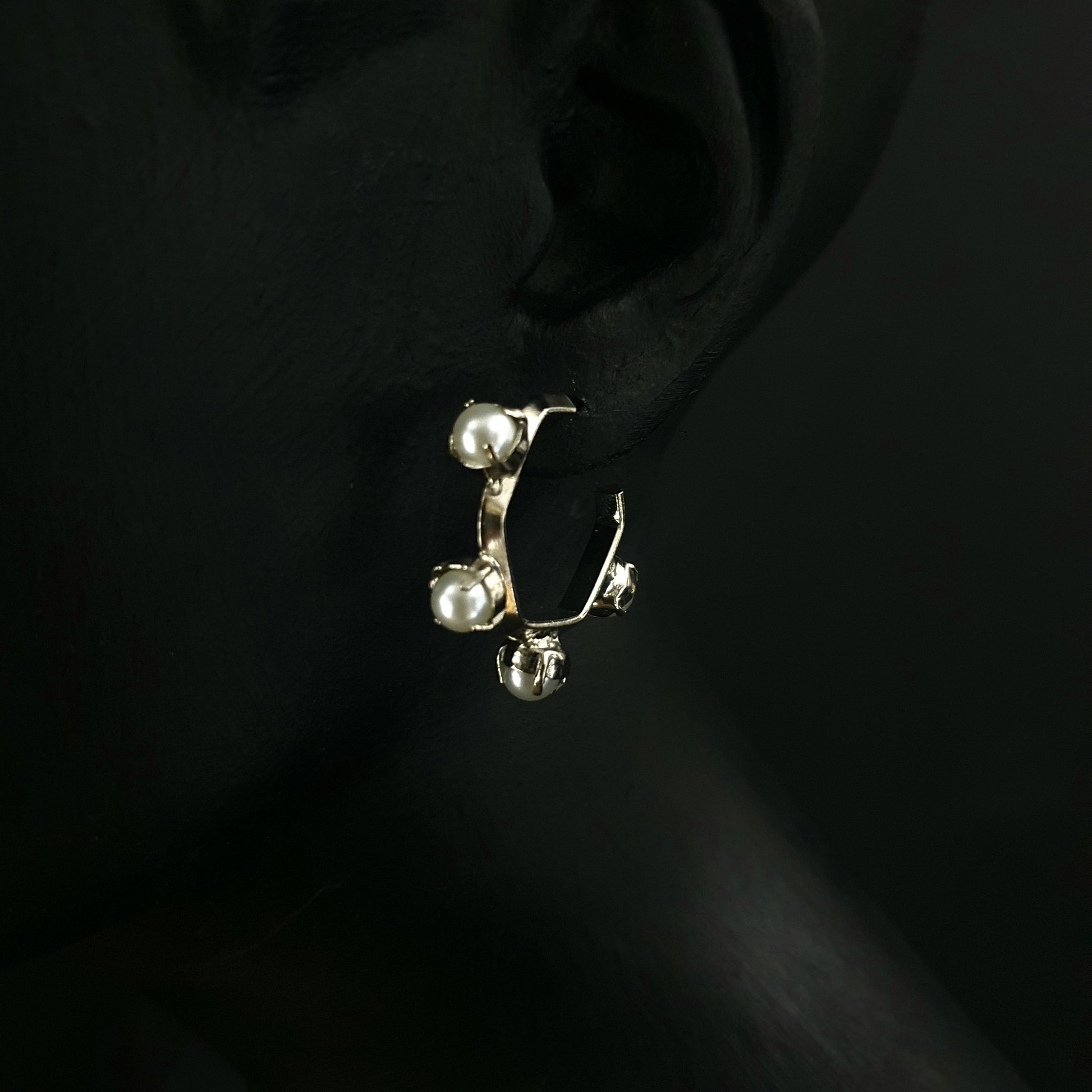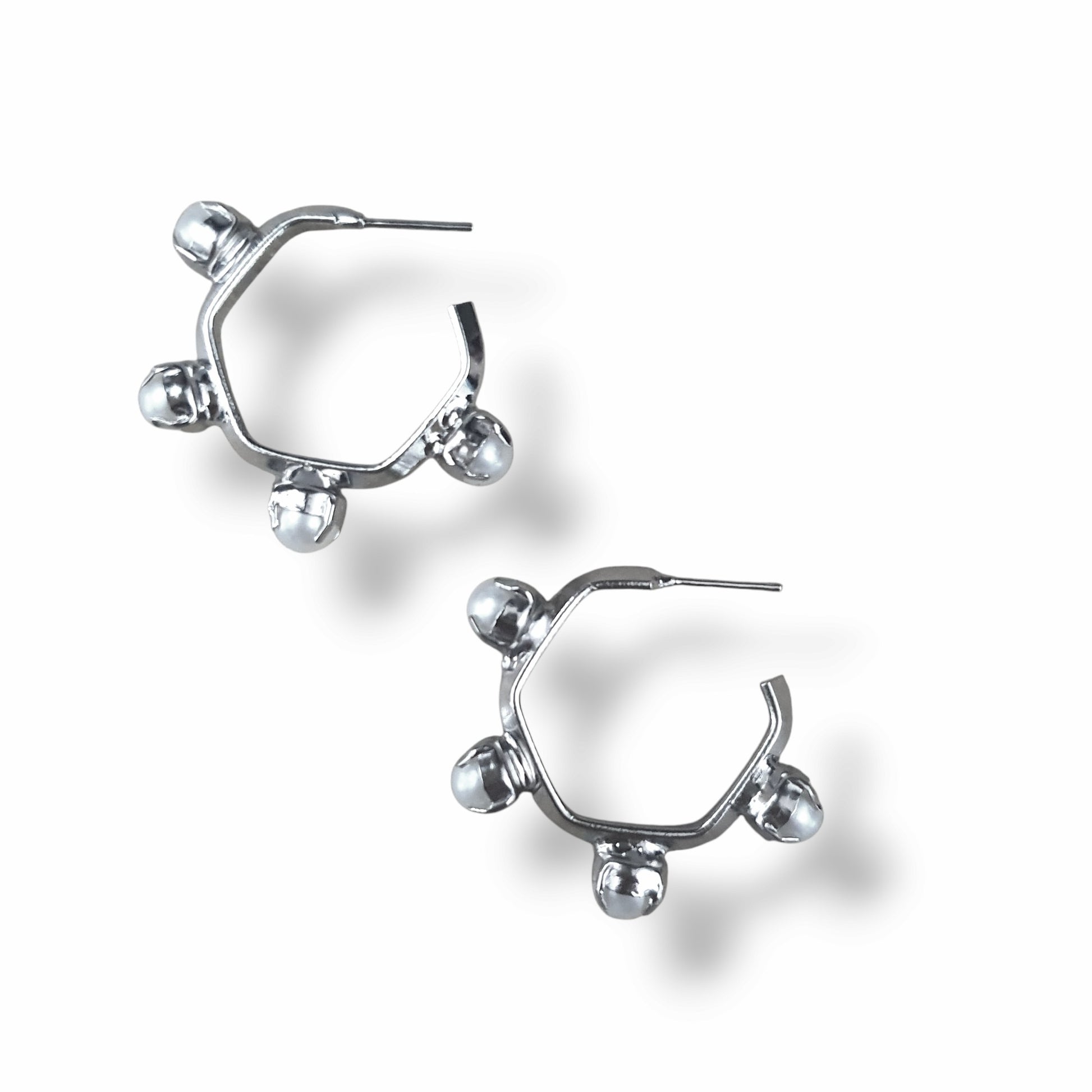 Arracadas geométricas con perlas en acabado plateado brillante. 3 cms.