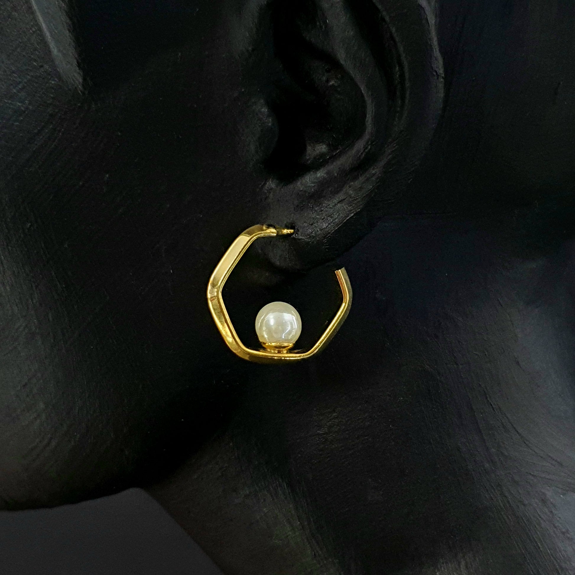 Arracadas geométricas con perlas en acabado dorado brillante. 2.5 cms.