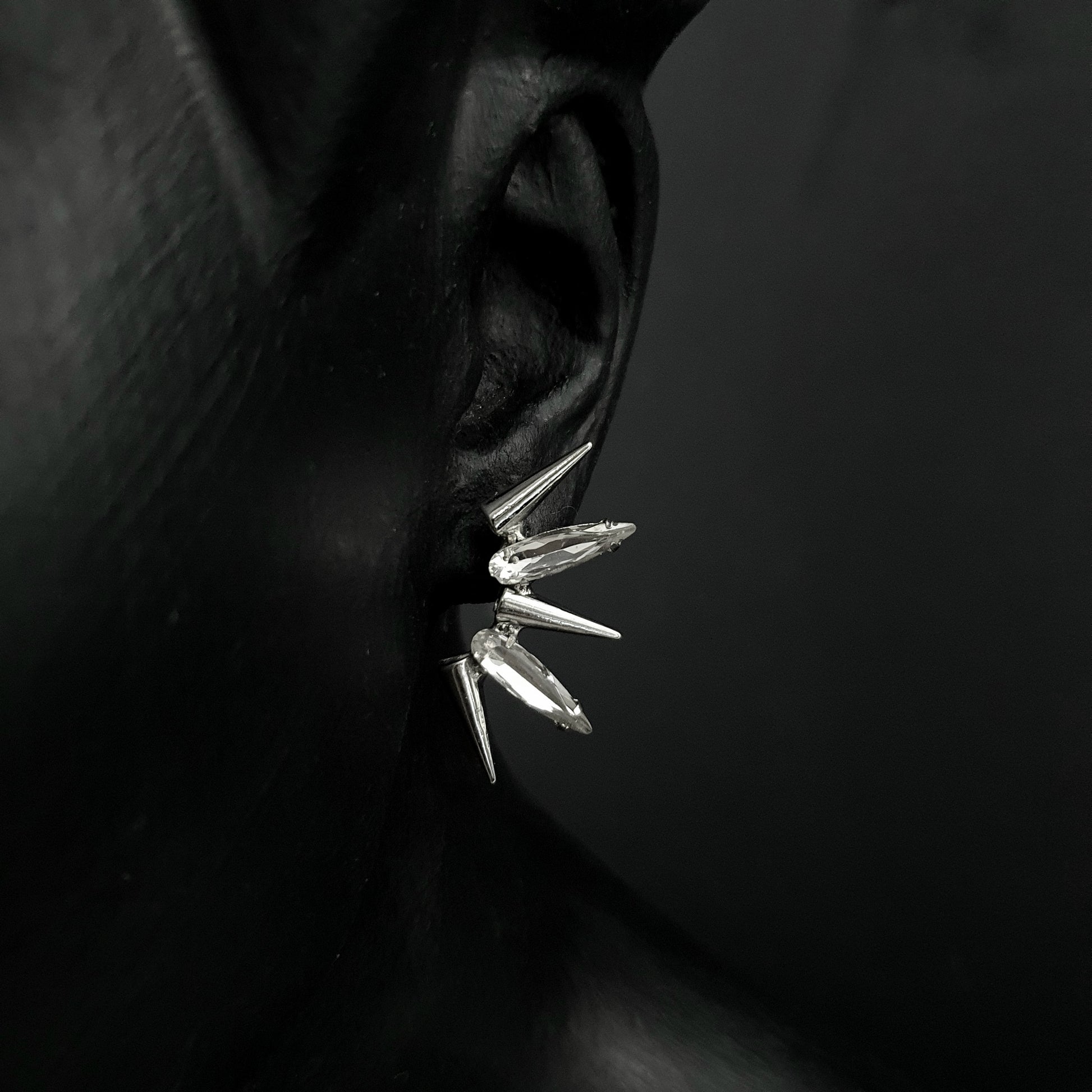 Aretes con picos y cristales en acabado plateado brillante. 3.5 cms.