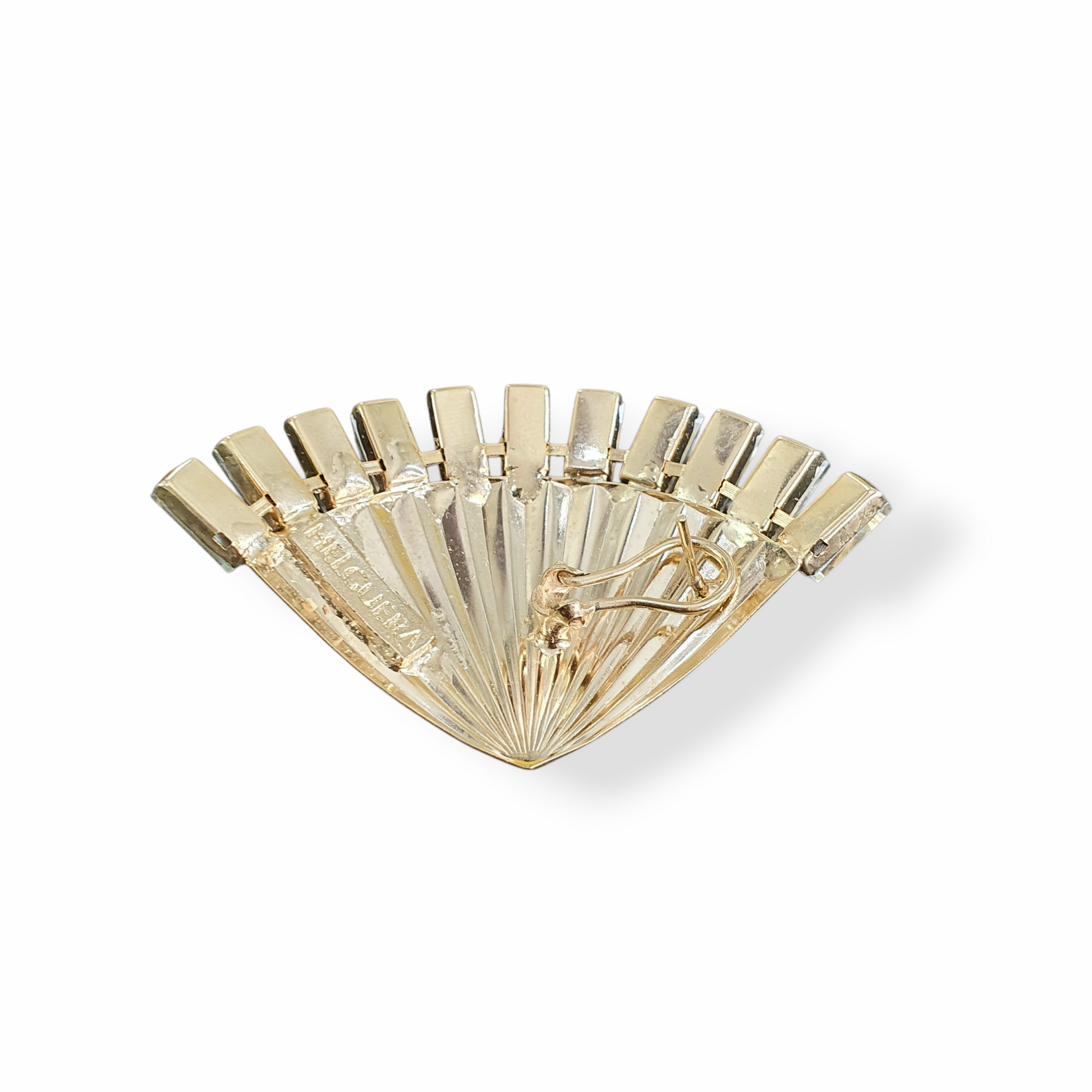 Aretes de metal con acabado dorado brillante y cristales AB. 7 cms. de largo y 4.5 cms. de ancho.