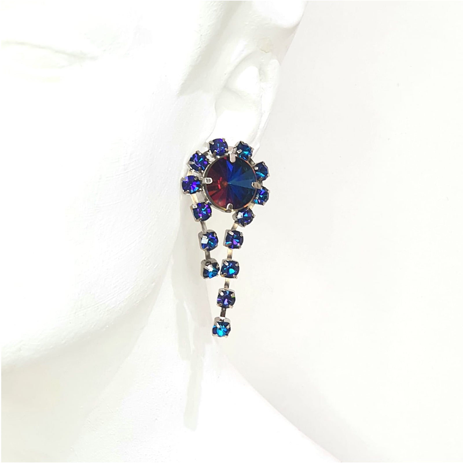 Aretes plateados con cristales checoslovacos y centro con cristal de Swarovski vintage, 6.5 cms, pieza única.