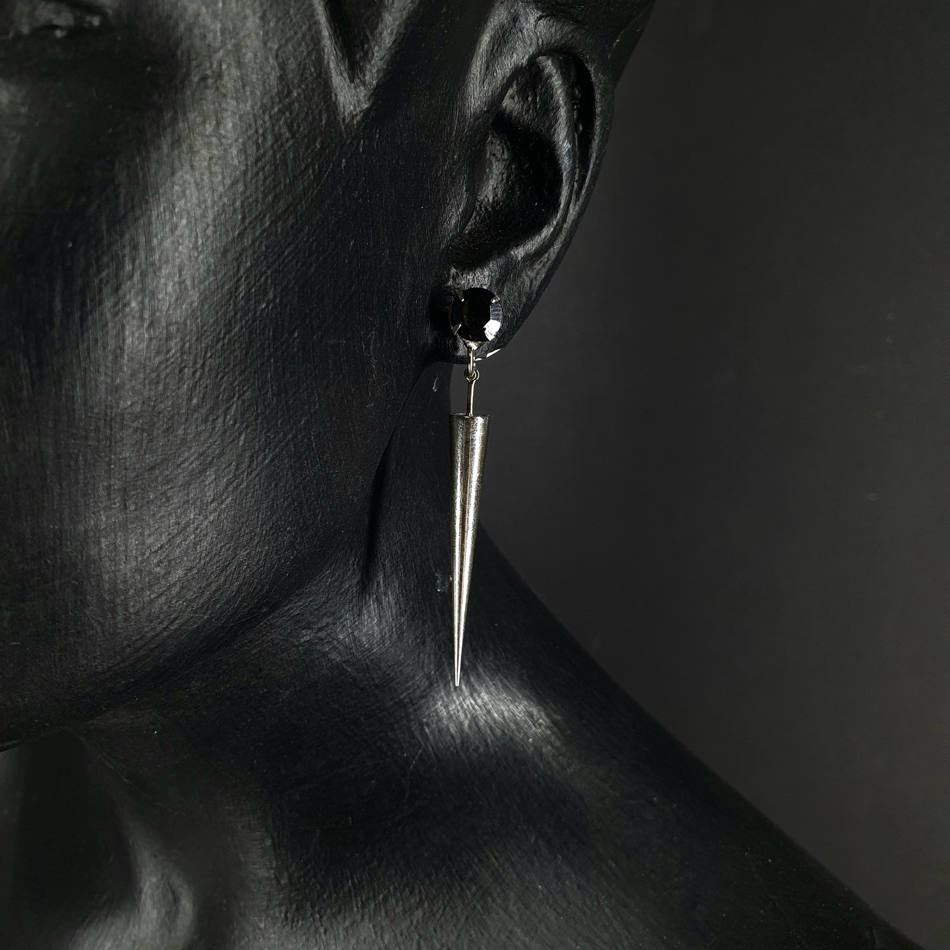Aretes con cristales negros y péndulo en forma de púa en acabado plateado brillante. 6.5 cms.