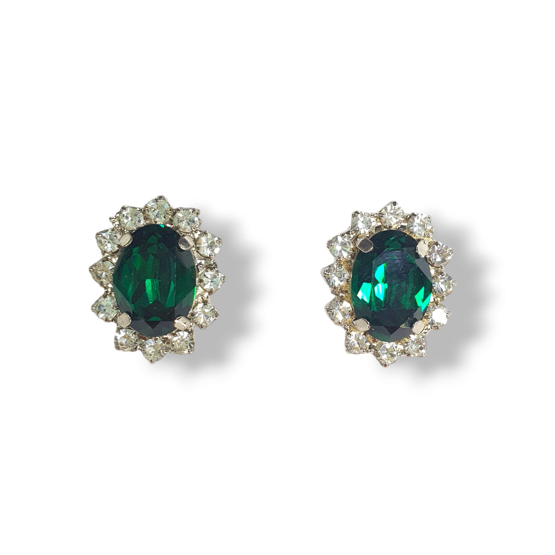 Aretes con cristales checoslovacos y cristal oval austriaco color verde esmeralda. 2 cms con poste en acabado plateado brillante.