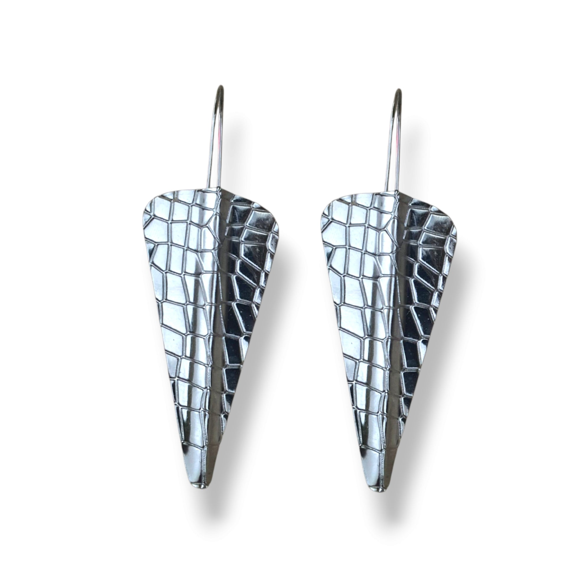 Aretes de metal en acabado plateado brillante y gancho largo. 8.5 cms.