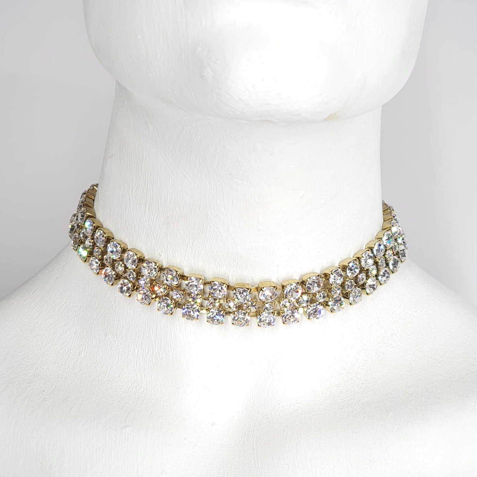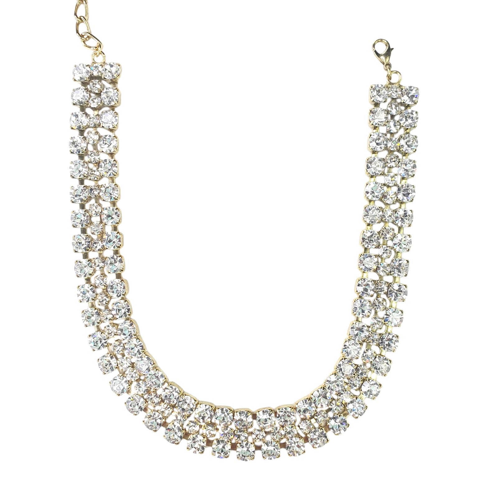 Choker de 3 líneas con cristales checoslovacos baño dorado, 32 cms más 8 cms de cadena de extensión 1.5 cms de ancho, 3 piezas.