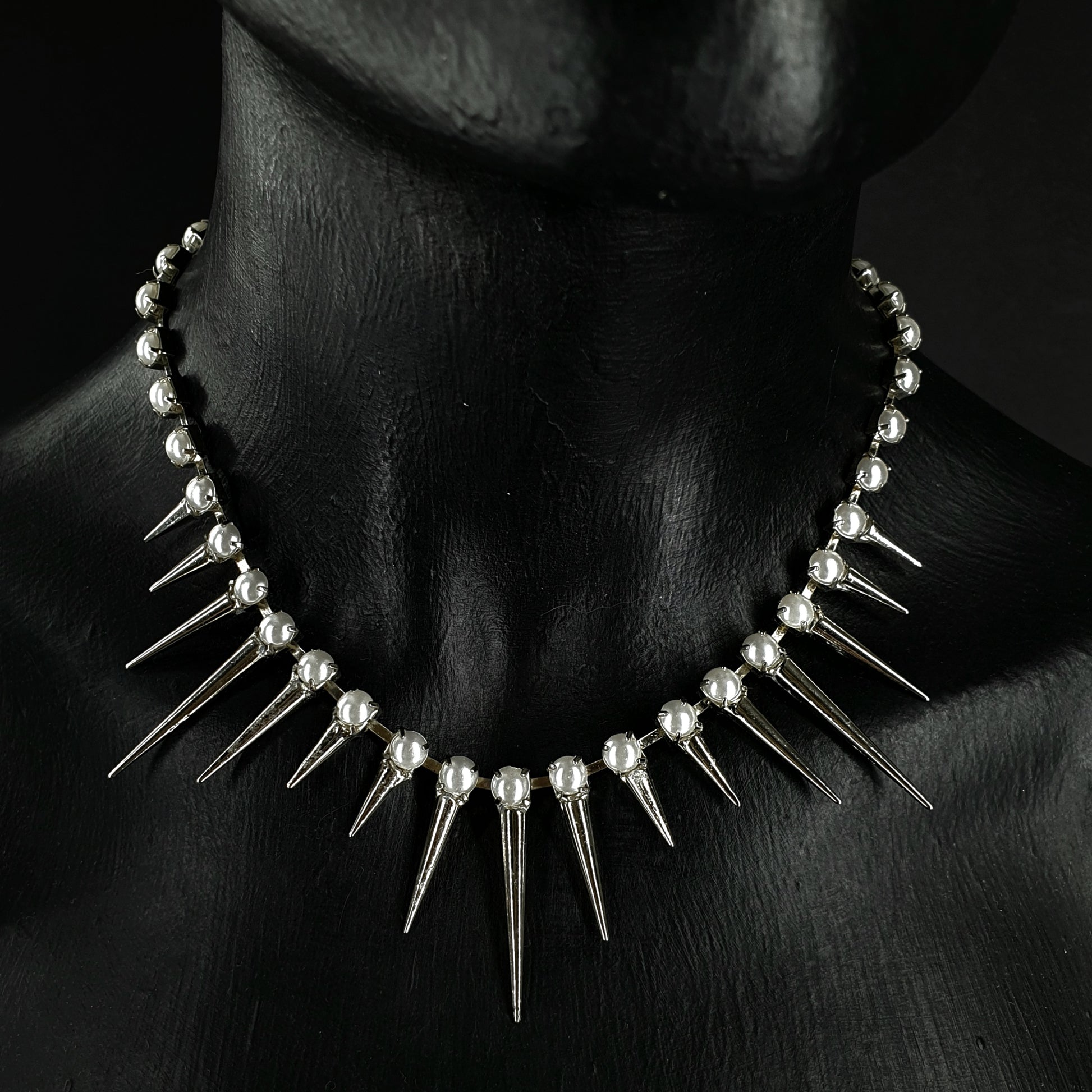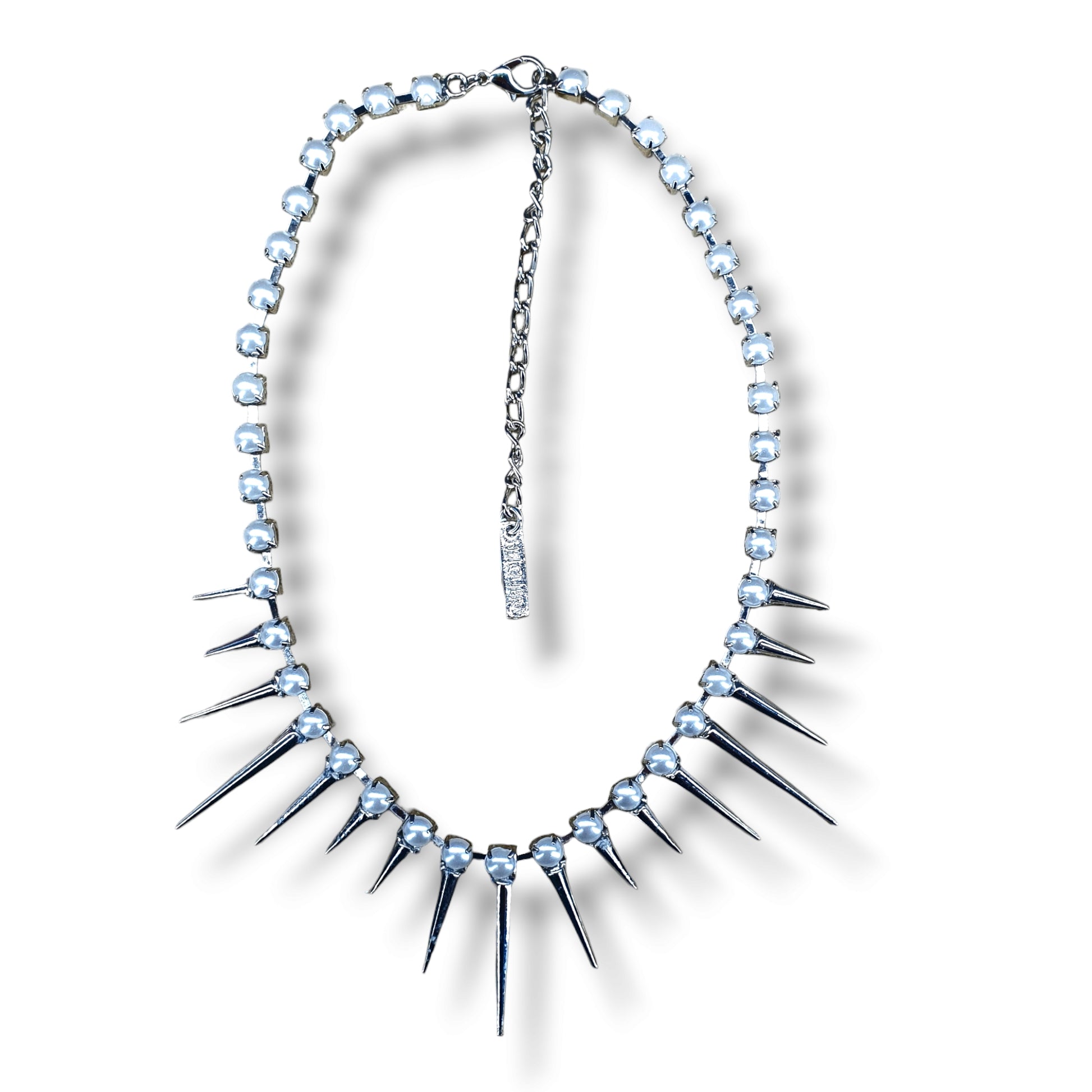 Collar con perlas y picos en acabado plateado brillante. Largo 40 cms. más 8 cms. de cadena de extensión.