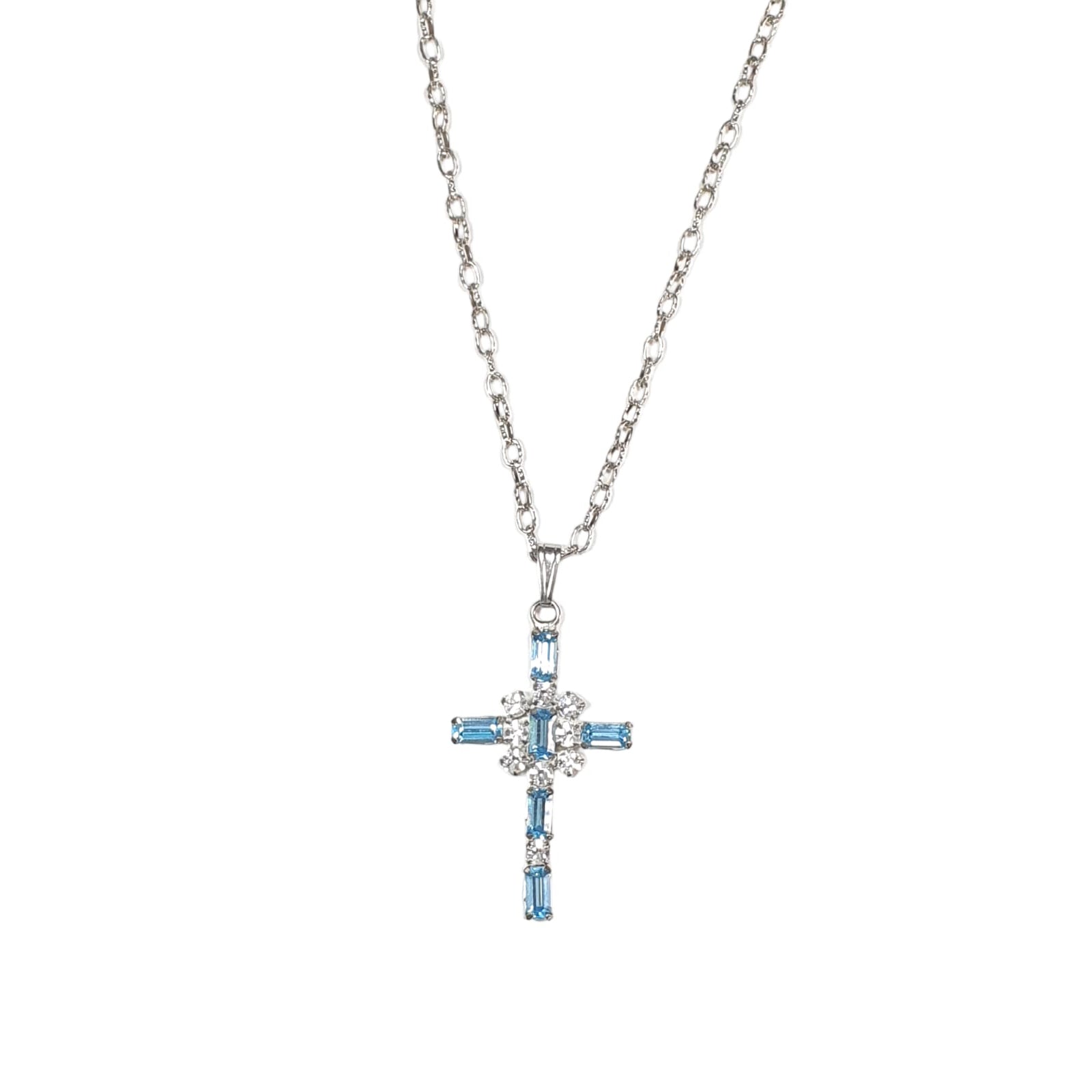 Cadena plateada con cruz con cristales color Acuamarine, cadena de 60 cms y cruz de 5 cms, 1 pieza.
