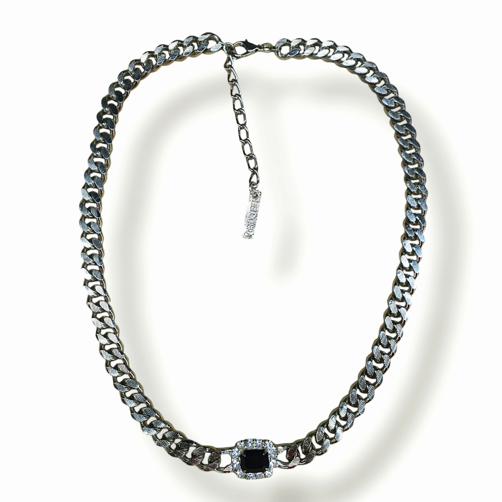Collar con cadena de 8 mm. de ancho y centro con cristales checoslovacos premium y un cristal austriaco al centro negro. Largo de 46 cms más 7 cms de cadena de extensión en acabado plateado brillante.