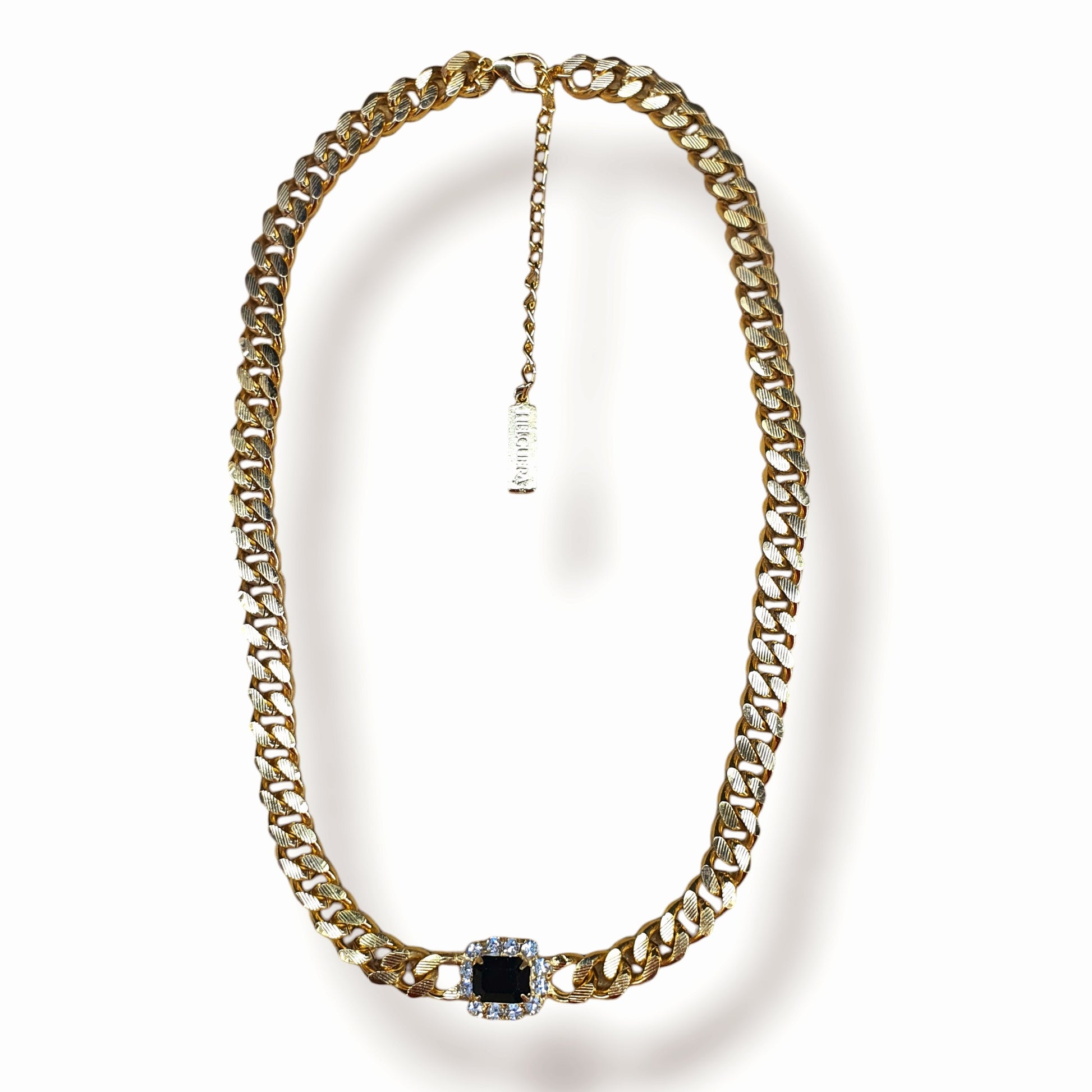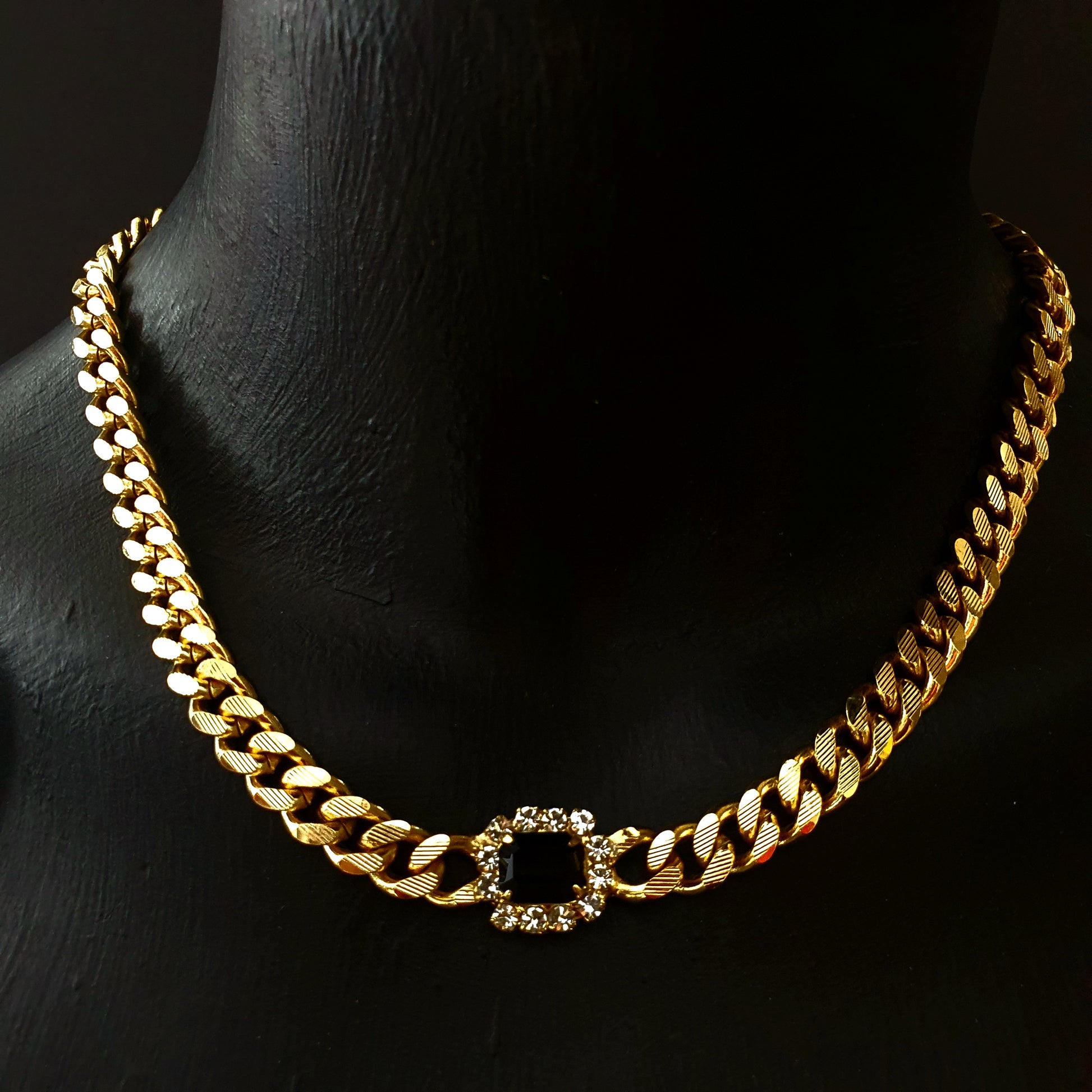 Collar con cadena de 8 mm. de ancho y centro con cristales checoslovacos premium y un cristal austriaco al centro negro. Largo de 46 cms más 7 cms de cadena de extensión en acabado dorado brillante.