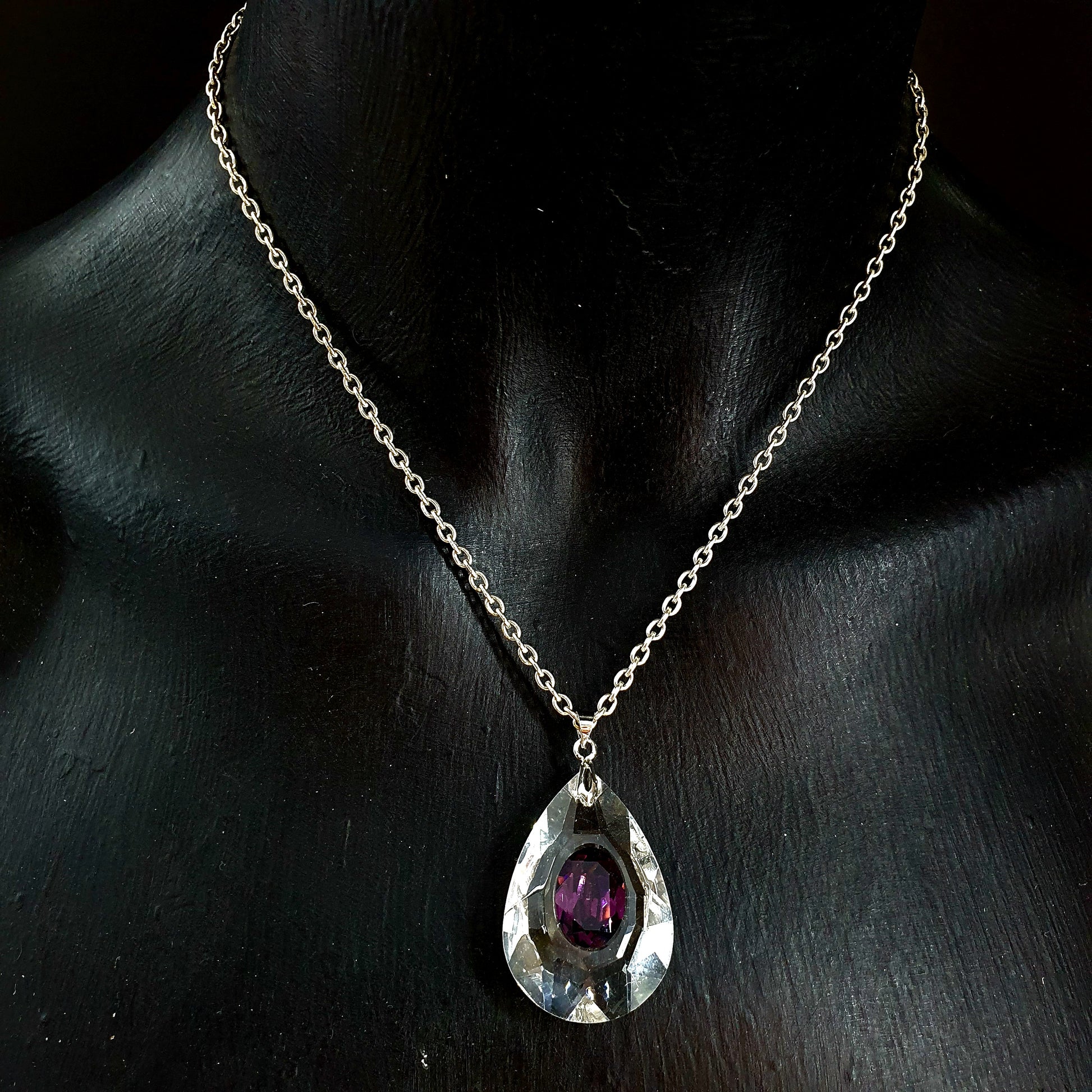 Collar con dije de cristal transparente facetado en forma de gota de 4 cms con un cristal oval austriaco color amatista. Largo de 40 cms y broche de T en acabado plateado brillante.
