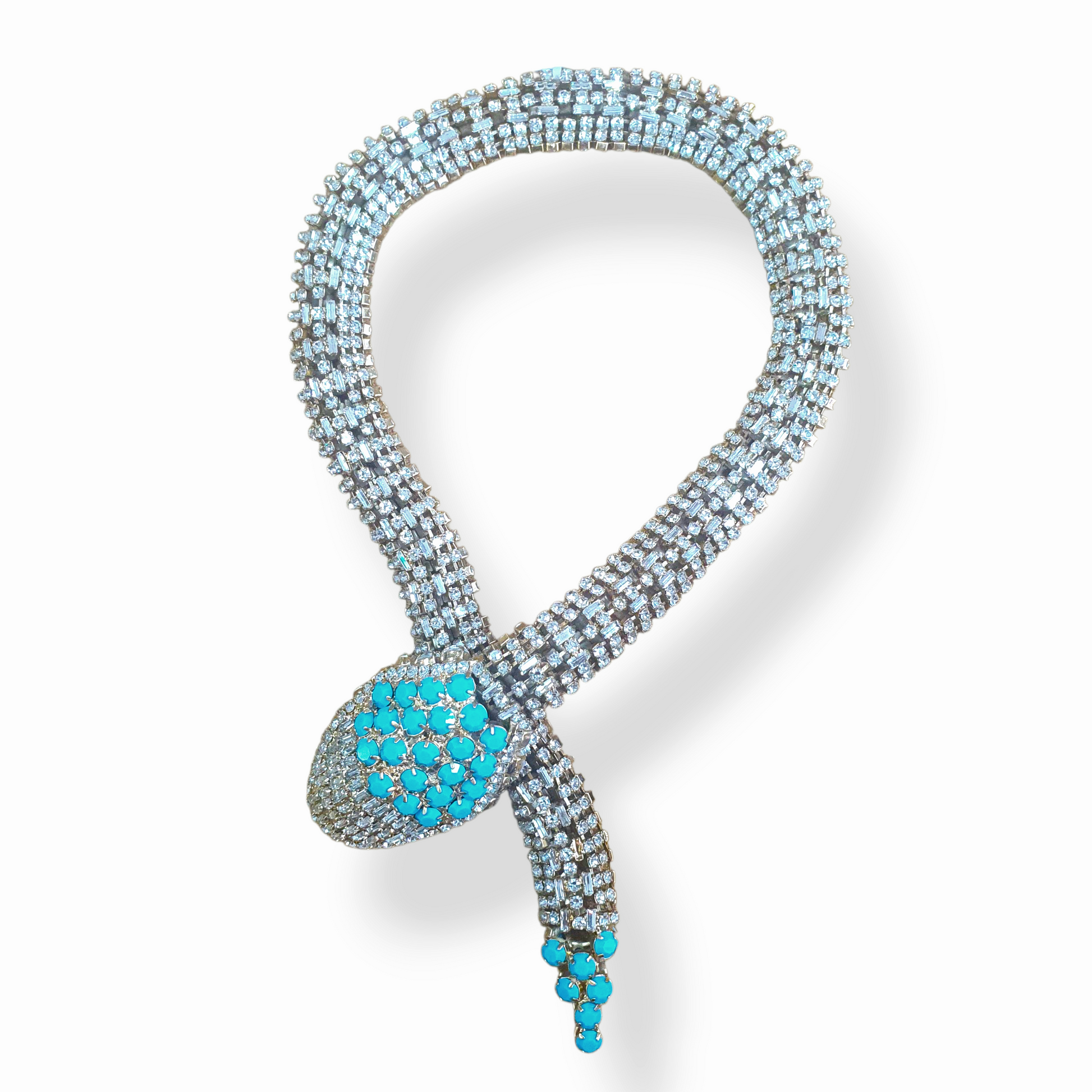 Collar en forma de vibora con cristales al frente y al dorso formando el cuerpo completo en acabado dorado brillante. 61 cms. de largo. Pieza única.