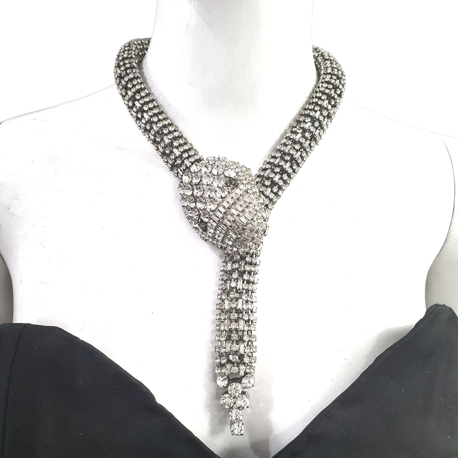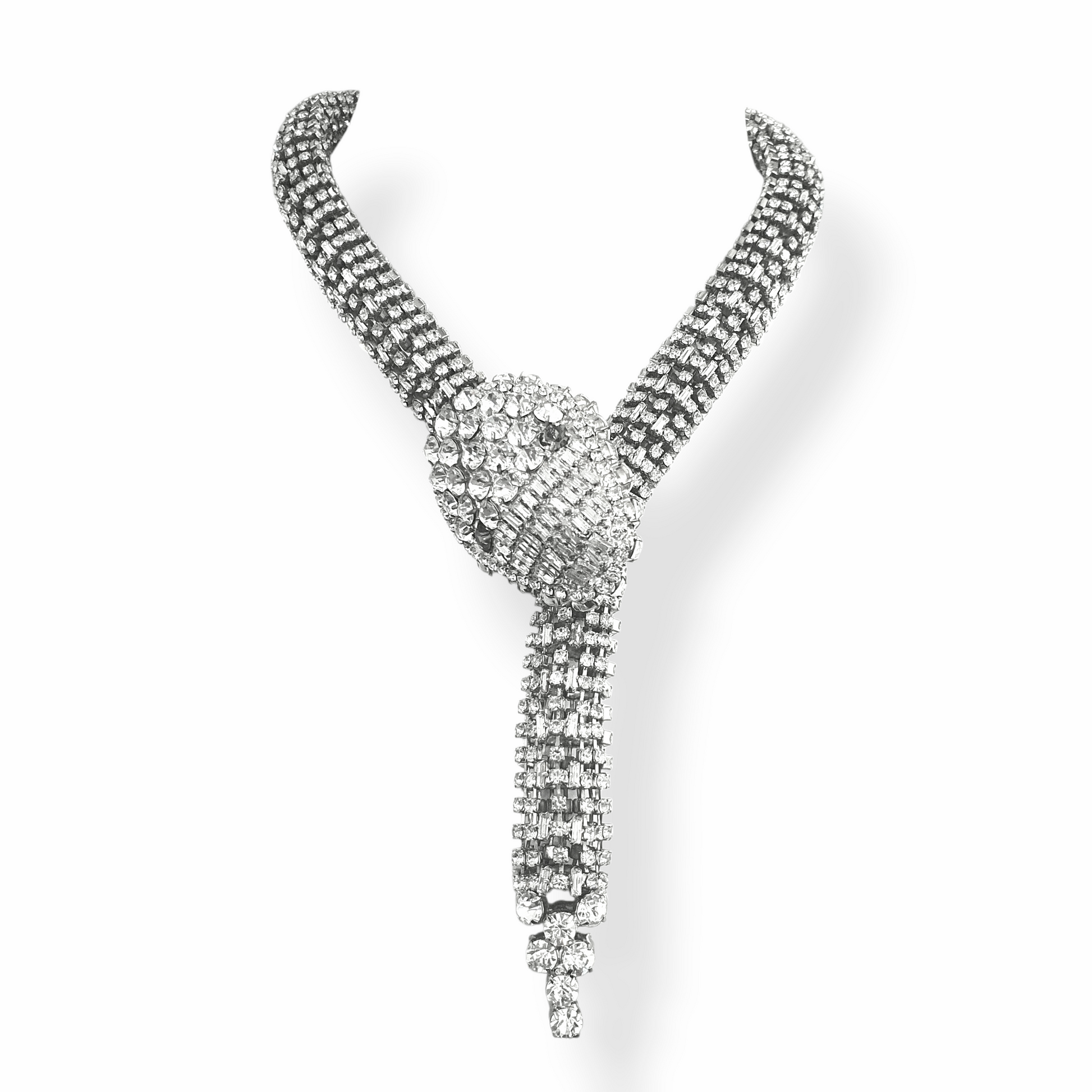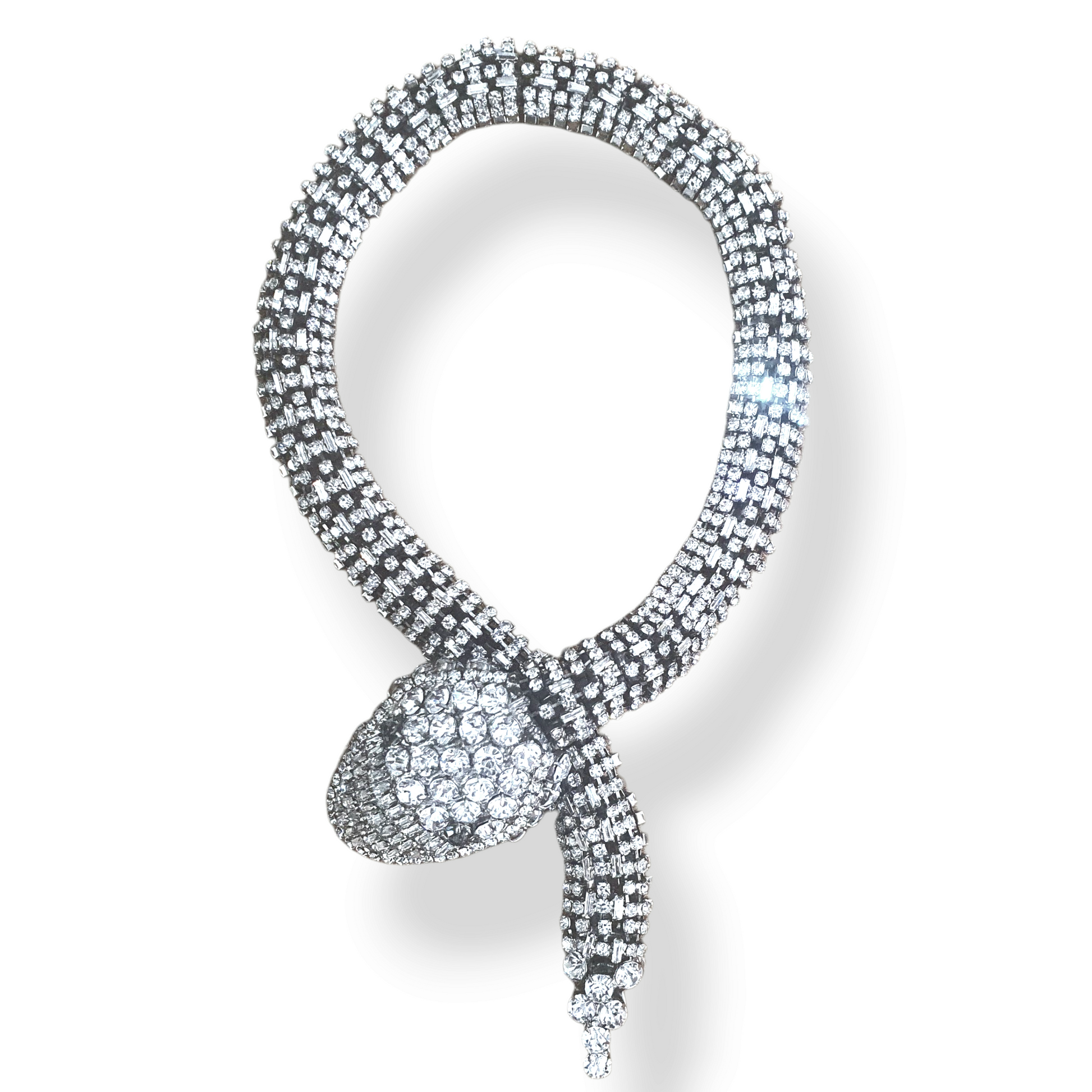 Collar en forma de vibora con cristales al frente y al dorso formando el cuerpo completo en acabado plateado brillante. 61 cms. de largo