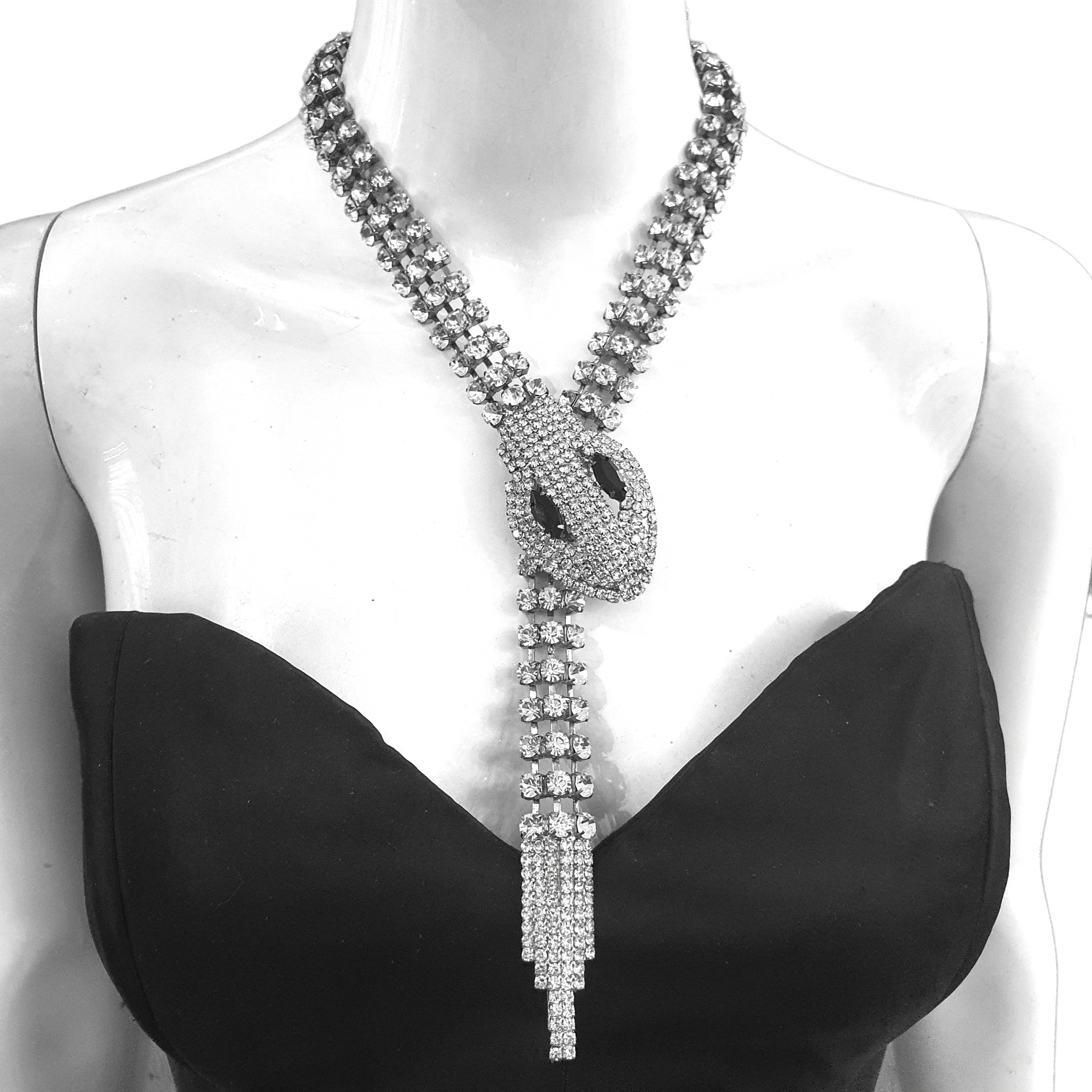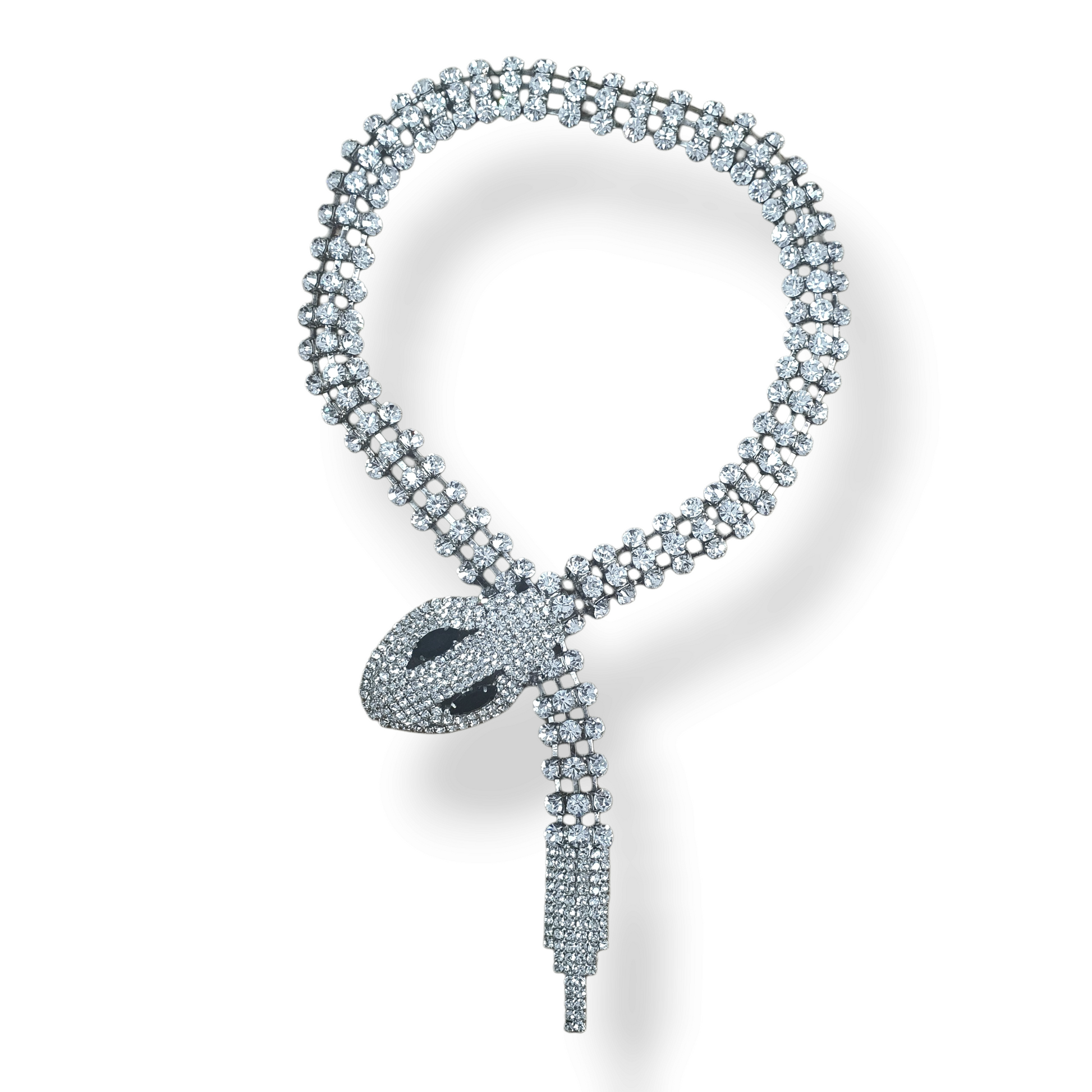 Collar en forma de vibora con cristales al frente en acabado plateado brillante. 64 cms. de largo