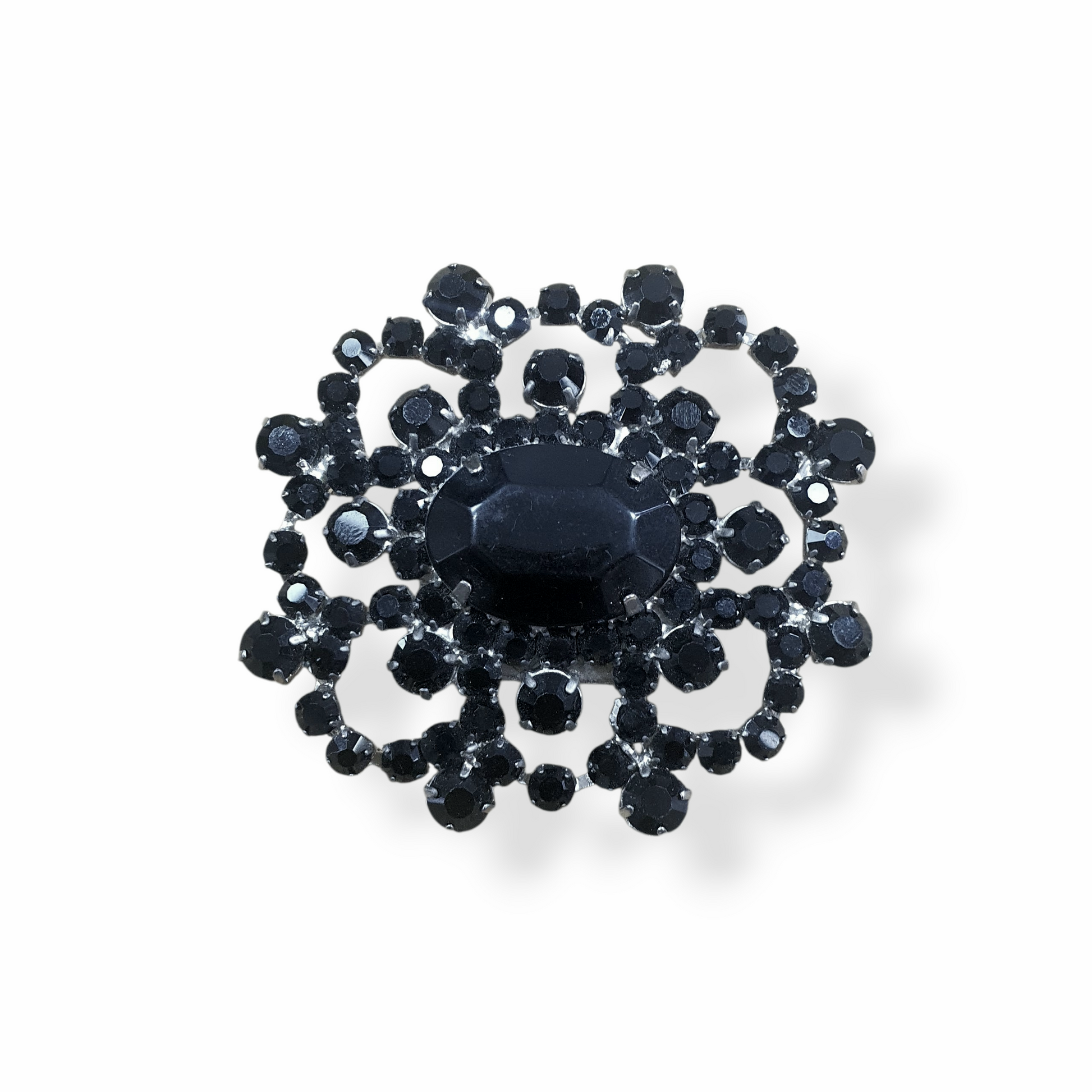 Prendedor con cristales negros y acabado plateado brillante. 6 cms por 7 cms.