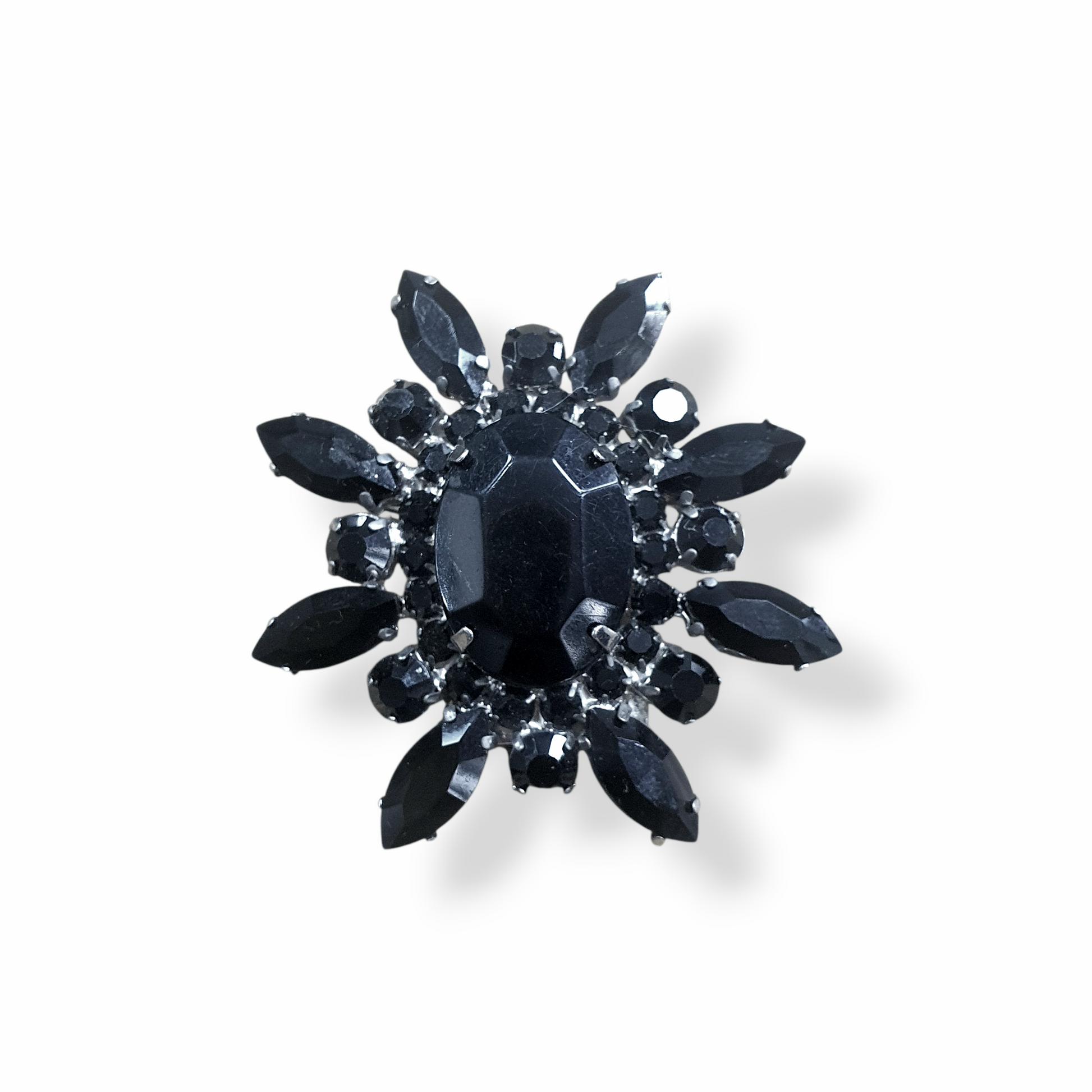 Prendedor con cristales negros y acabado plateado brillante. 6 cms por 5.5 cms