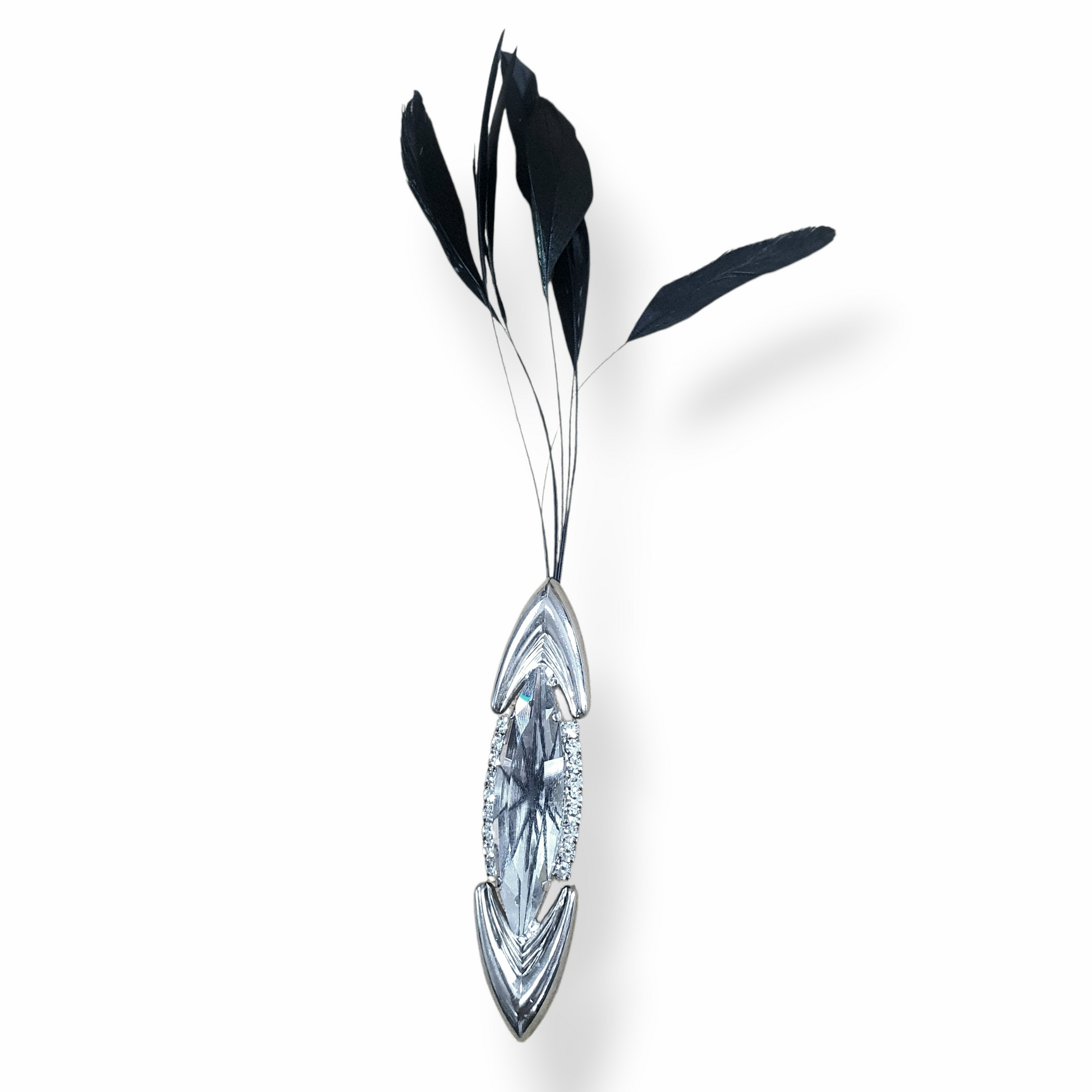 Prendedor con cristales y plumas negras en acabado plateado brillante. Plumas 13 cms, cuerpo de cristal y metal 9 cms por 2 cms