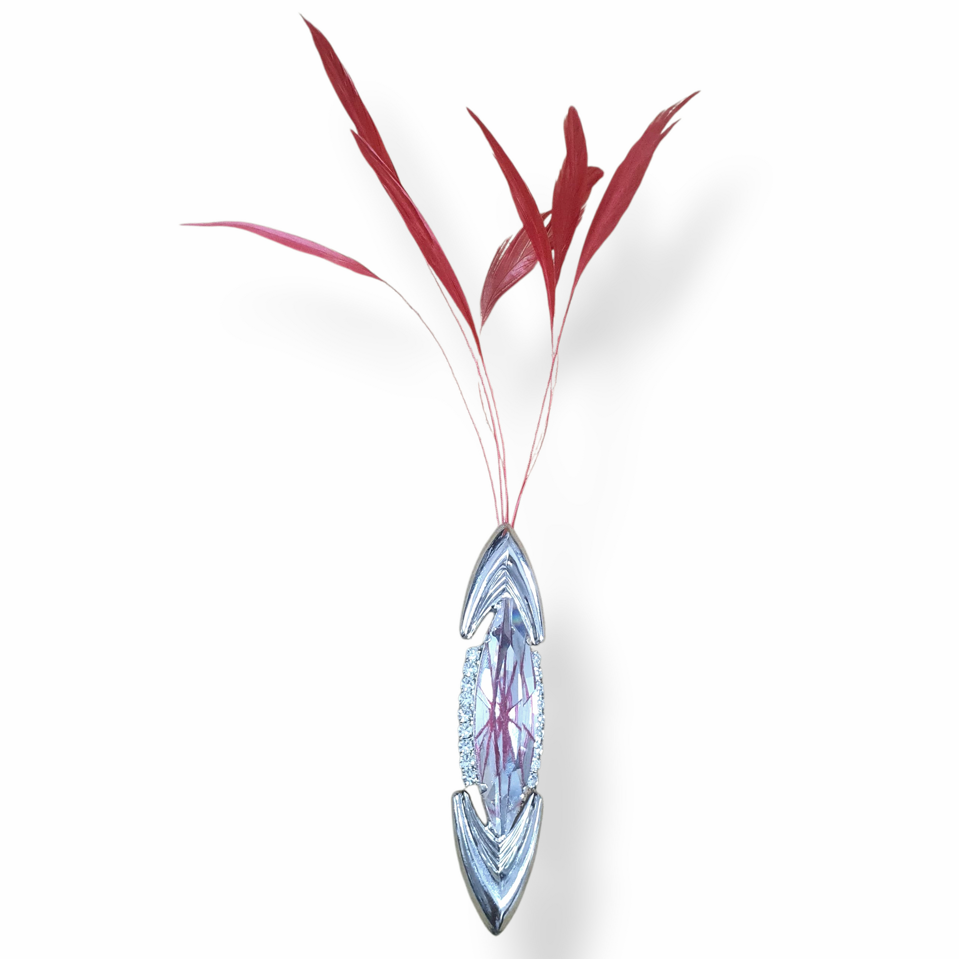 Prendedor con cristales y plumas rojas en acabado plateado brillante. Plumas 13 cms, cuerpo de cristal y metal 9 cms por 2 cms